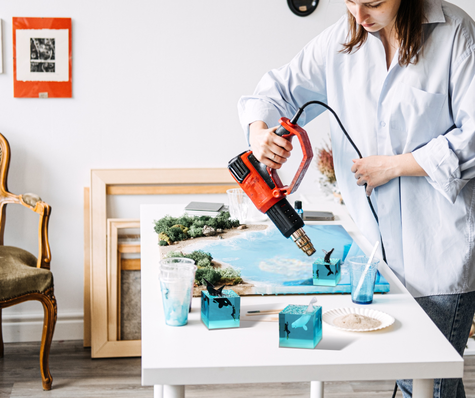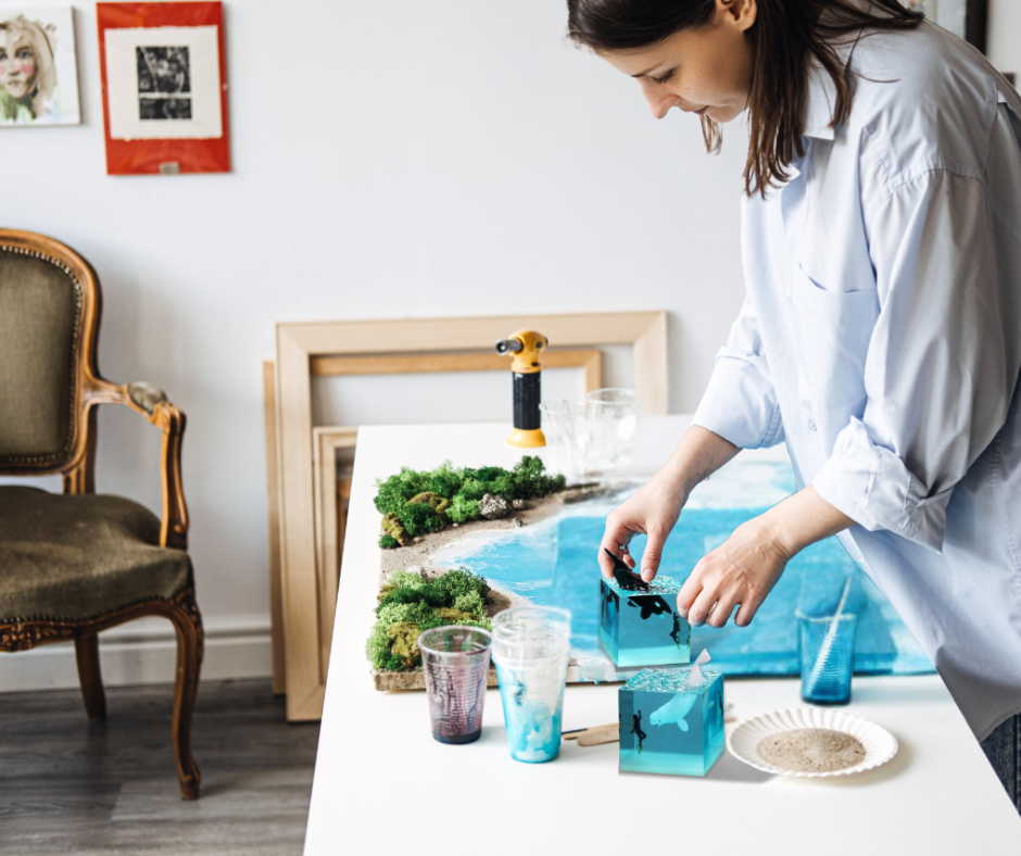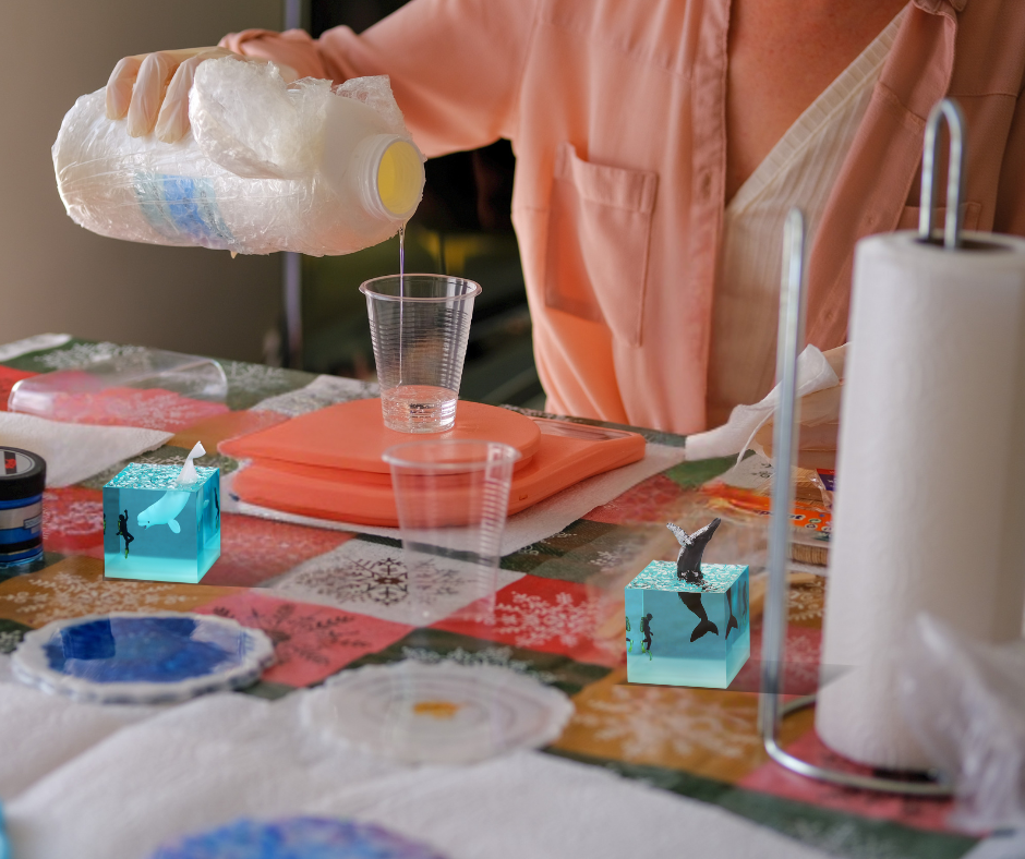 Resin is poured layer by layer, creating depth and gradients that resemble the ocean.