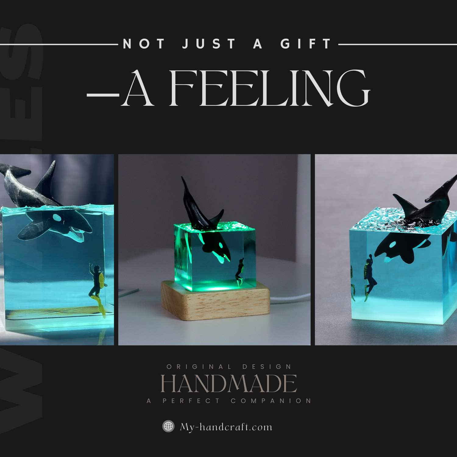 This handcrafted resin cube immortalizes the breathtaking leap of a humpback whale soaring above the waves. Made from eco-friendly epoxy resin, each piece is sculpted by hand, featuring lifelike ocean textures on top and glow-in-the-dark pigments at the base—creating a glowing underwater dream under UV light.