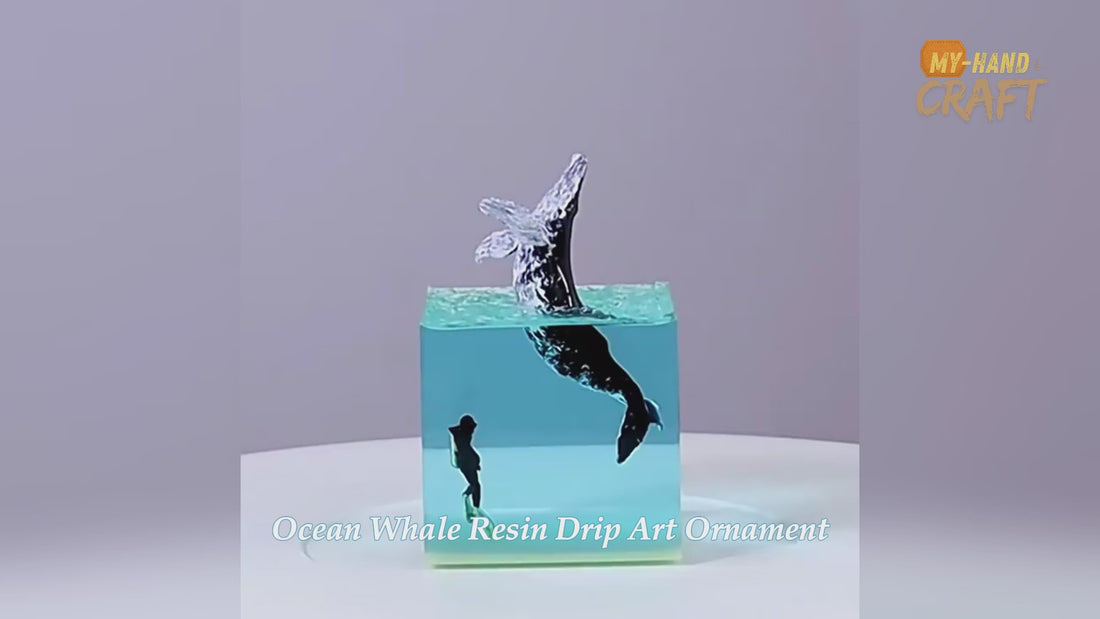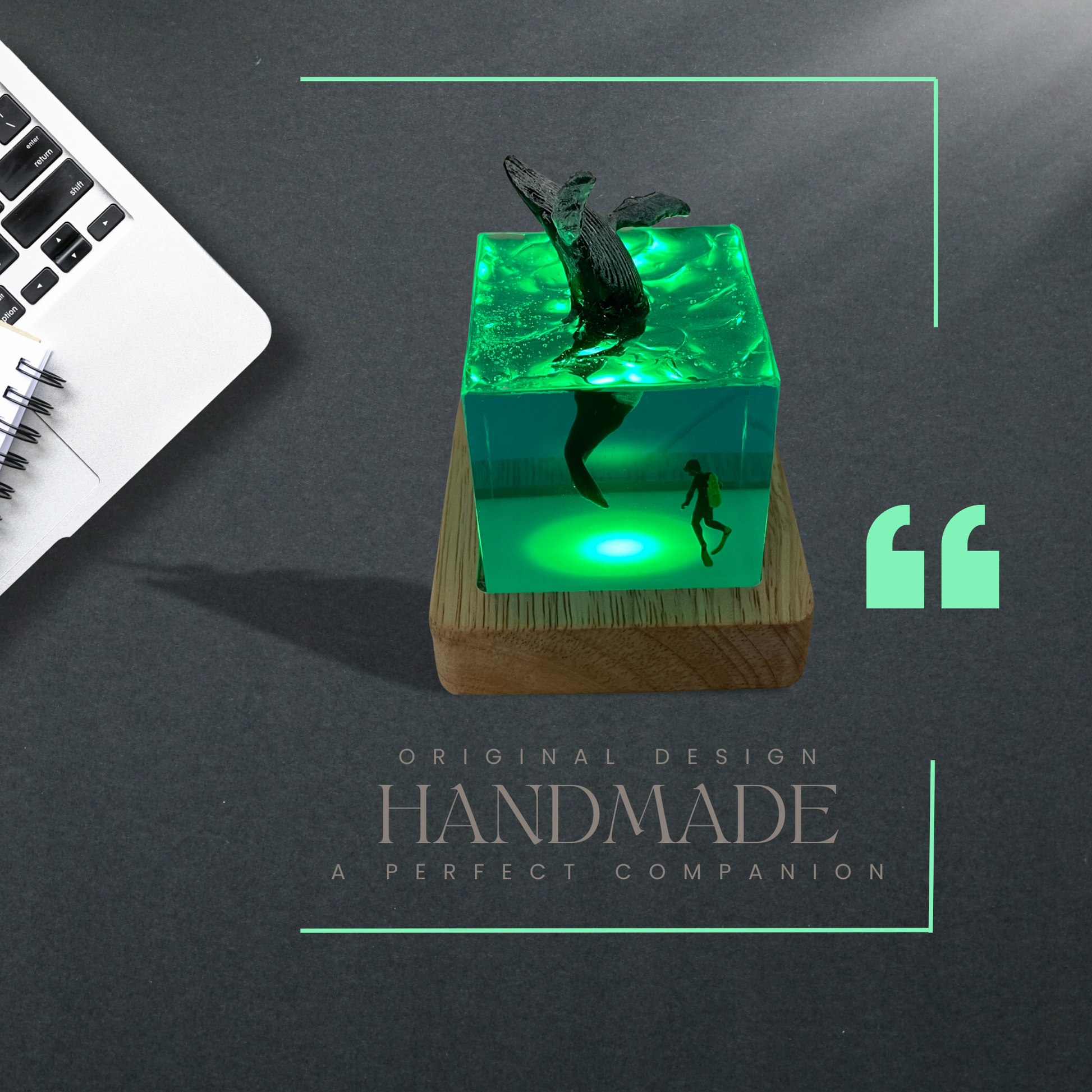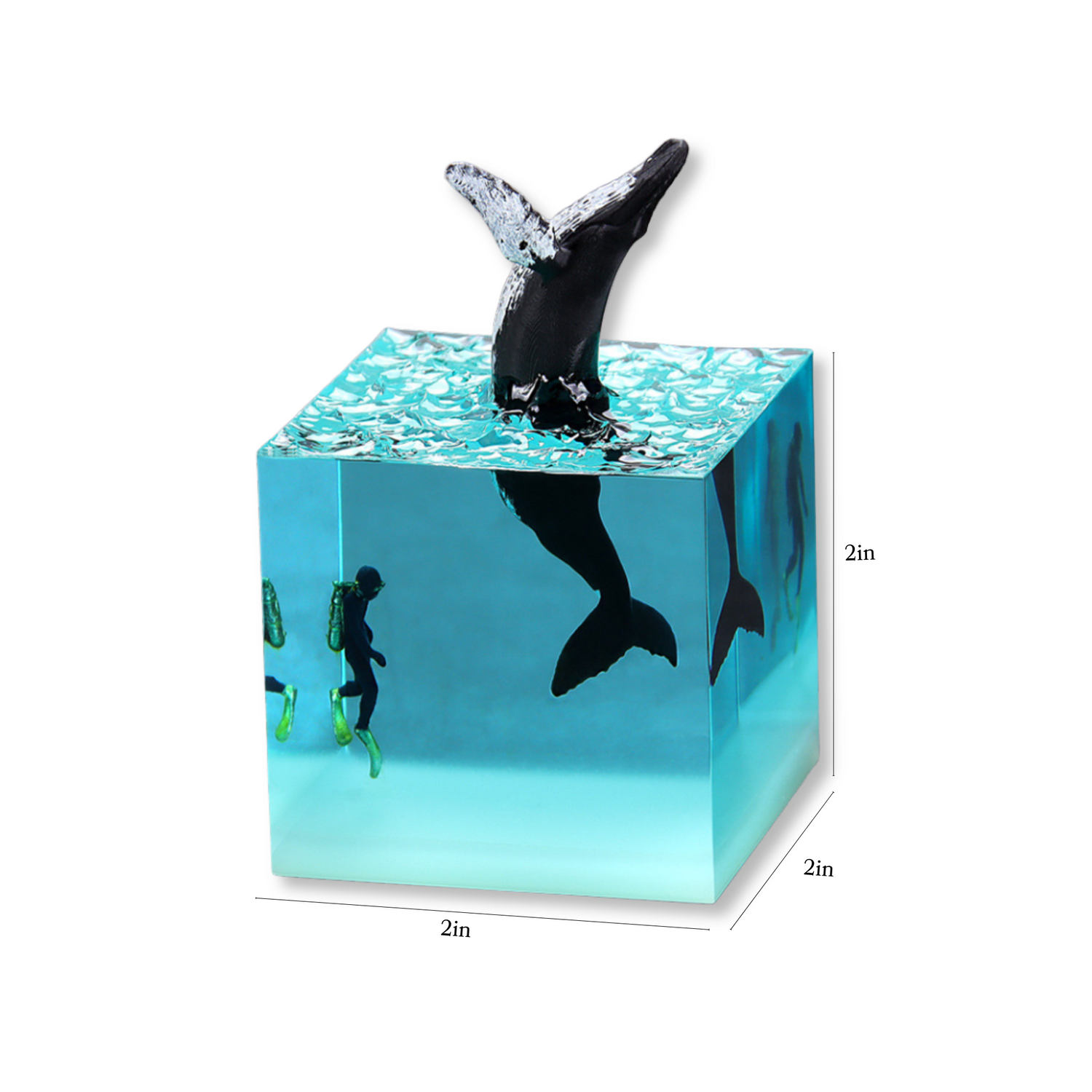 Bring the ocean’s magic to your desk!This handcrafted resin cube captures a majestic whale leaping from shimmering waves.