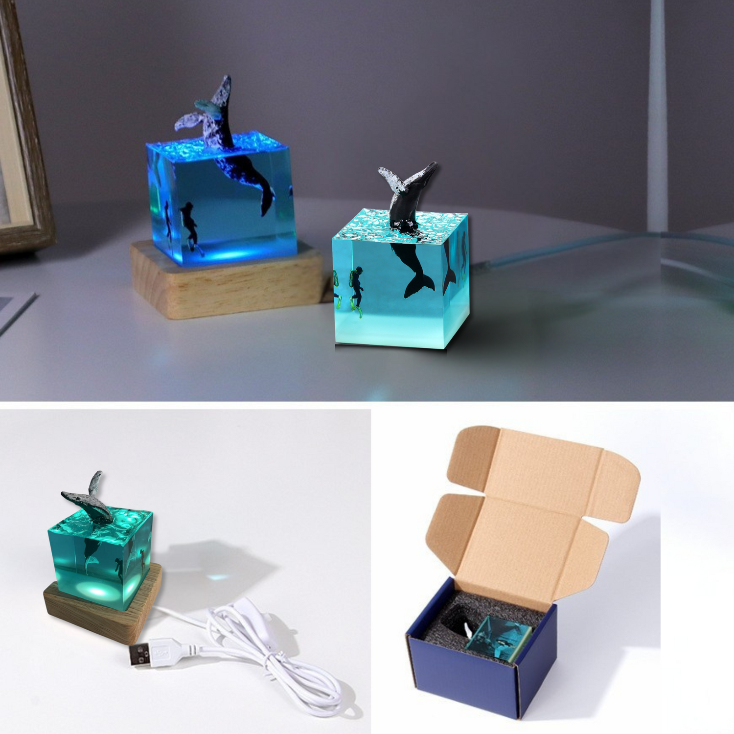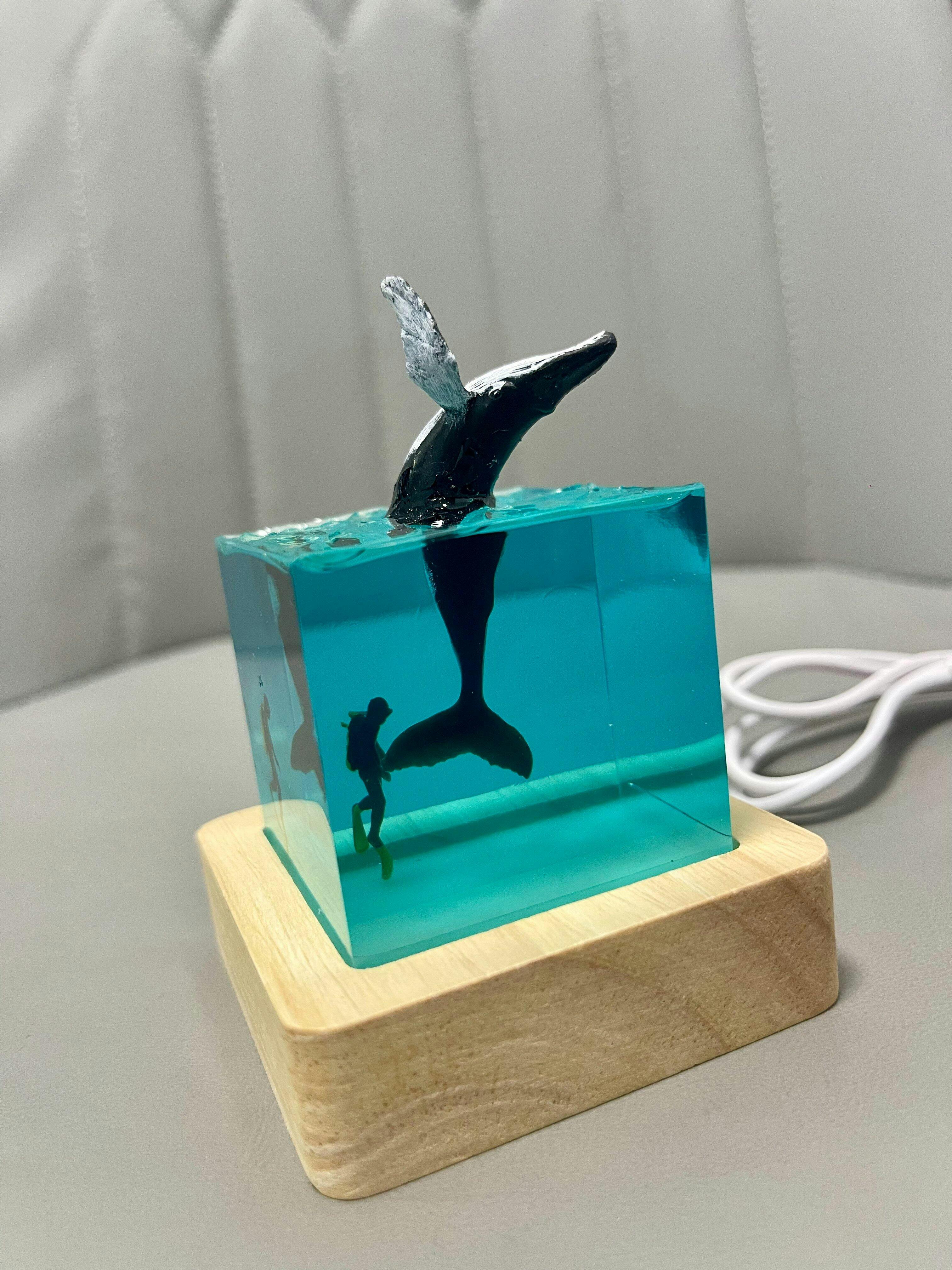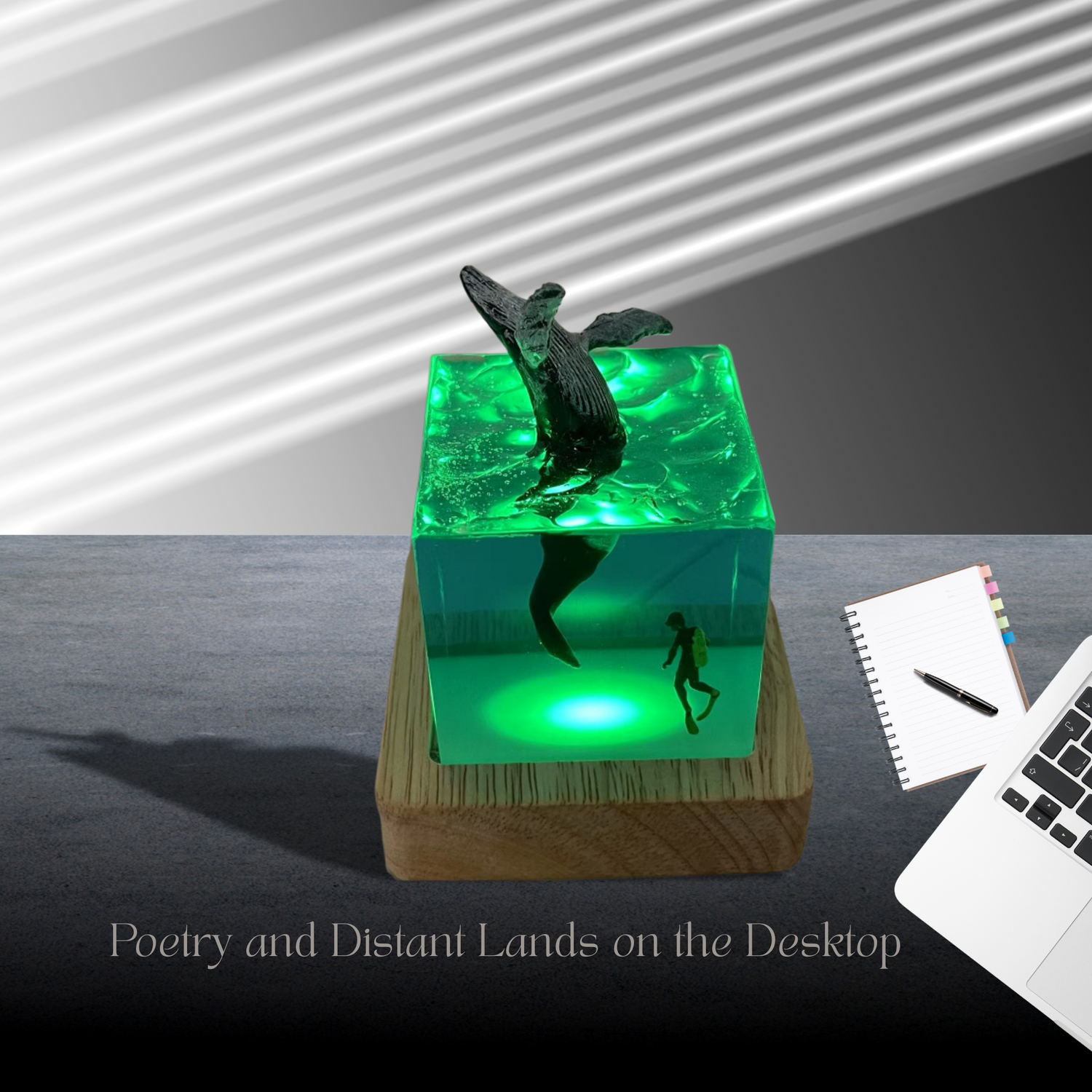 Bring the ocean’s magic to your desk!This handcrafted resin cube captures a majestic whale leaping from shimmering waves.