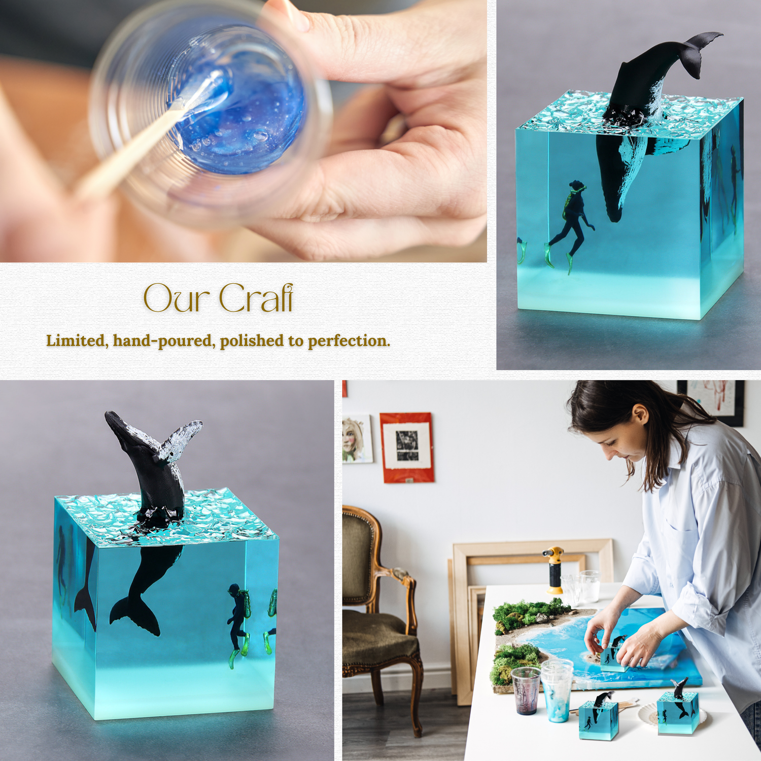 This piece stands as a classic within our Ocean Whales handcrafted collection. It captures both the whale's majestic leap from the shimmering surface and the moving encounter as it dives toward the depths to meet a diver.Crafted entirely by hand using eco-friendly materials like resin, it undergoes multiple processes.Paired with a multi-color LED base, it serves as both a stunning decorative art piece and a uniquely thoughtful gift.